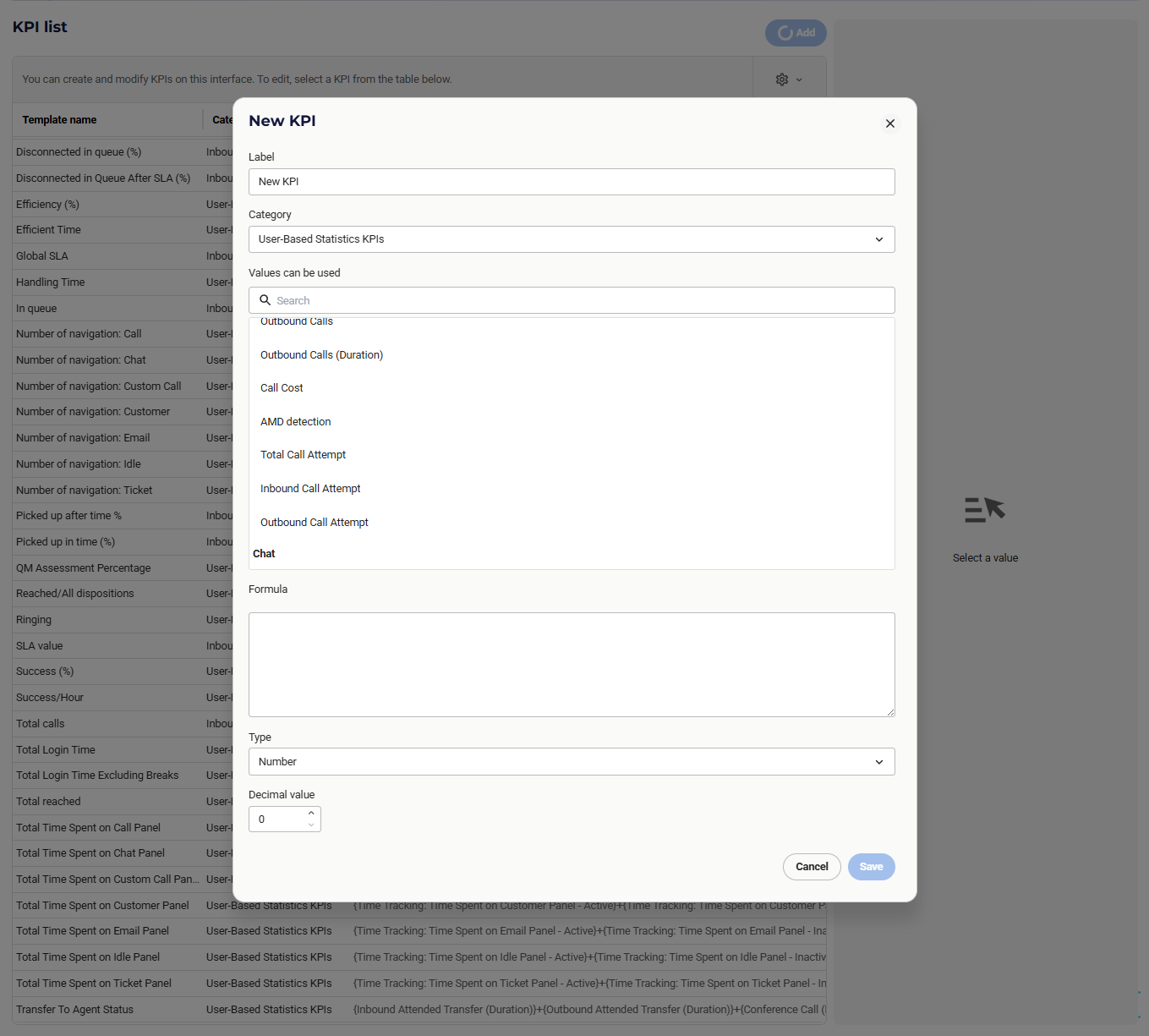 +, -, *, /, (, )). Read the next chapter about all available functions. In our example, we set up our formula like this:( {Reached}+{Successful}+{Dropped Calls} ) / {Outbound Calls} - Select a Format for your KPI: it can be a Number, Percent or Time. In our example, we are using Percent.